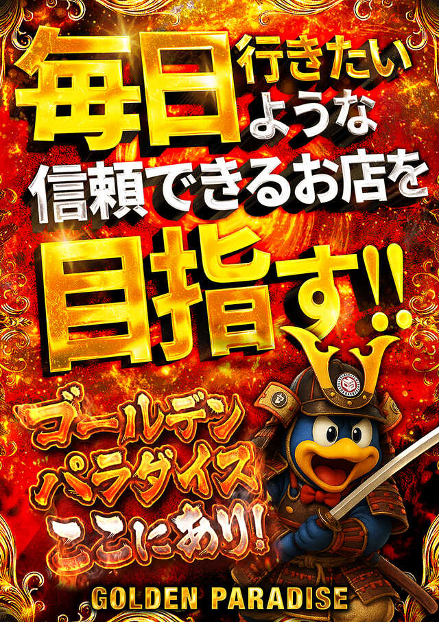 お客様に喜んで頂けるよう今後も努力しつづけます。おもしろさ200パーセント!!ますます躍進しつづけるゴールデンパラダイスを今後とも宜しくお願いします。